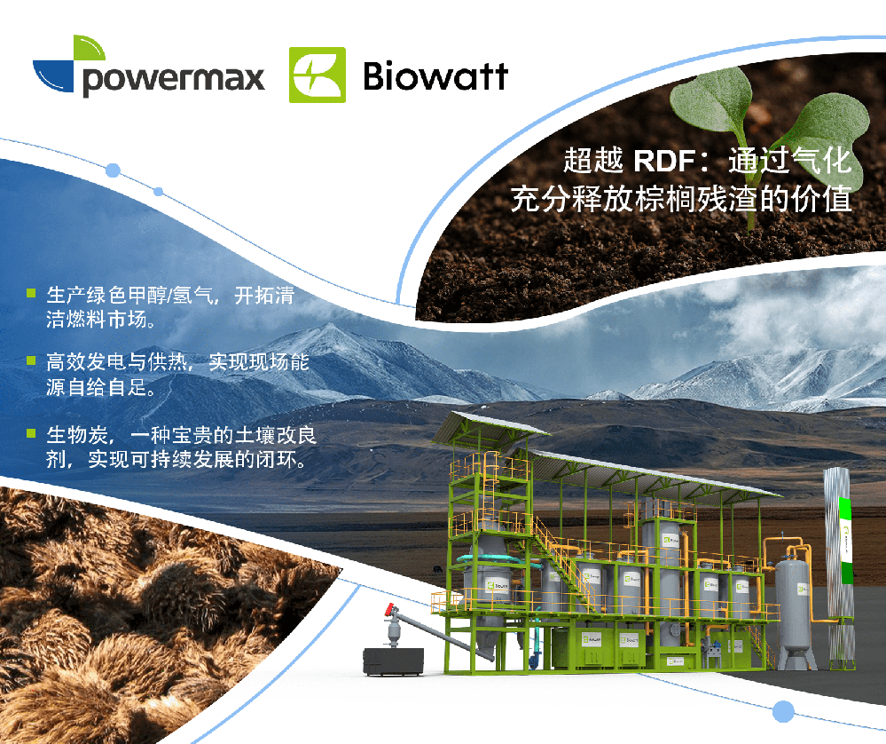 采用先进棕榈残渣气化技术,将低利润 RDF 出口转化为高收益。把空果串(EFB)和果壳转化为合成气,用于生产绿色甲醇、氢能、电力、热能及生物炭,从废弃物出口商转型为可持续绿色能源引领者。